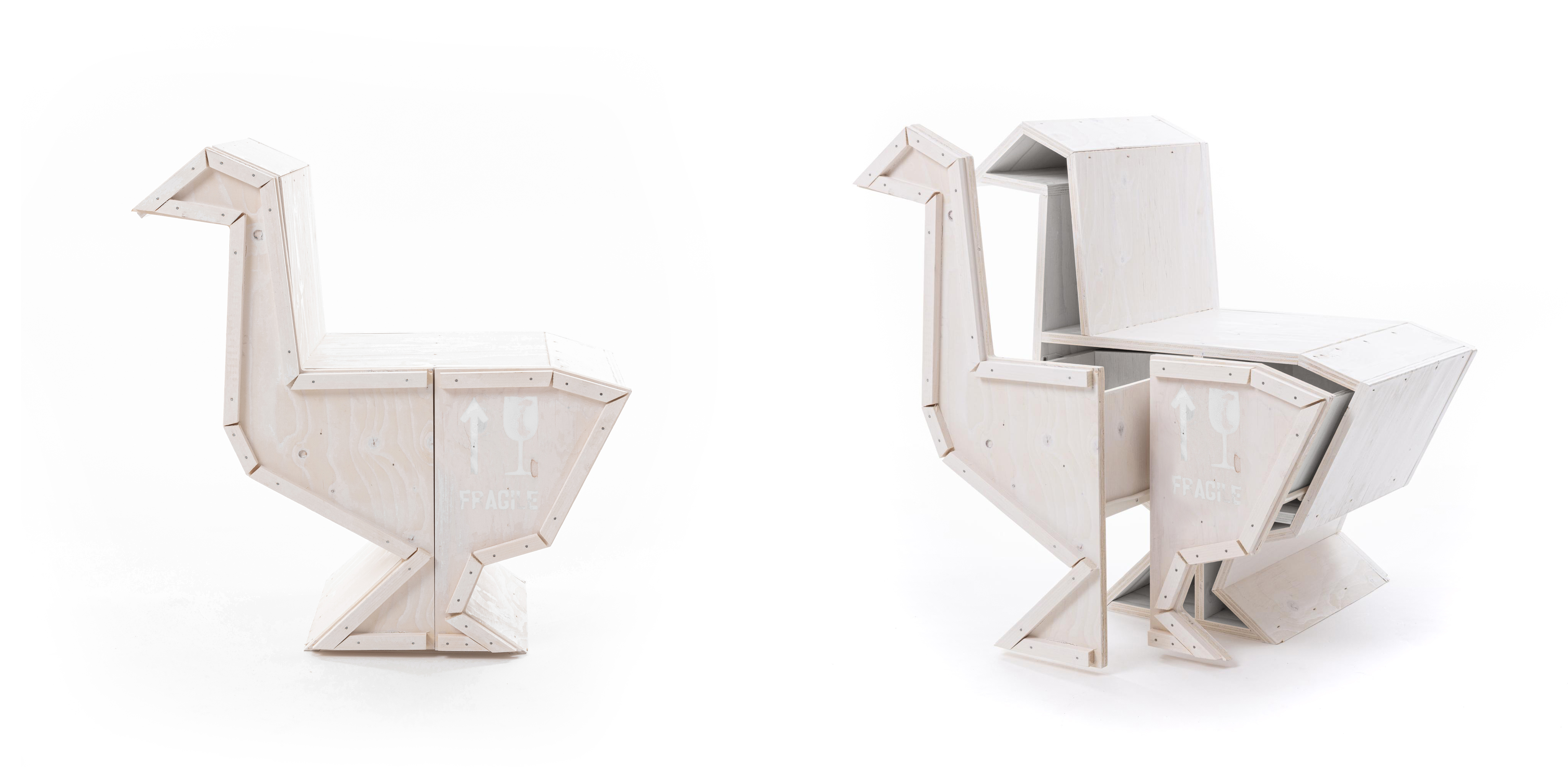 Questo mobile rappresenta un immaginario assurdo dove gli animali vengono fisicamente spediti. Possibile? Per meglio esprimere il concetto abbiamo scelto i tre classici animali da fattoria. Le imperfezioni che il prodotto presenta sono una caratteristica del prodotto stesso, poiché per rispettare la poetica dell'idea abbiamo realizzato questi mobili con gli stessi processi che si usano per produrre vere casse da imballaggio.